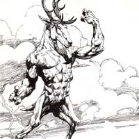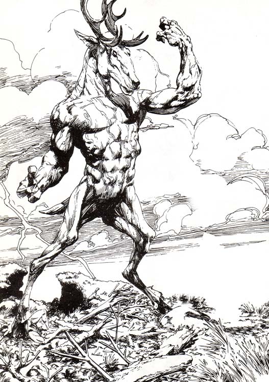 El terrible Dios Astado. Un ser de más de cincuenta pies de alto. Antropoide salvo las piernas y la cabeza que son de ciervo demoníaco astado. Criatura mística de ominosa naturaleza que era la deidad de los elfos negroides de las selvas del sur. Fue muerto por los Vizcondes y algunos avezados marinos de la tripulación del Delilah, carraca pirata de Sigurd Lineani.